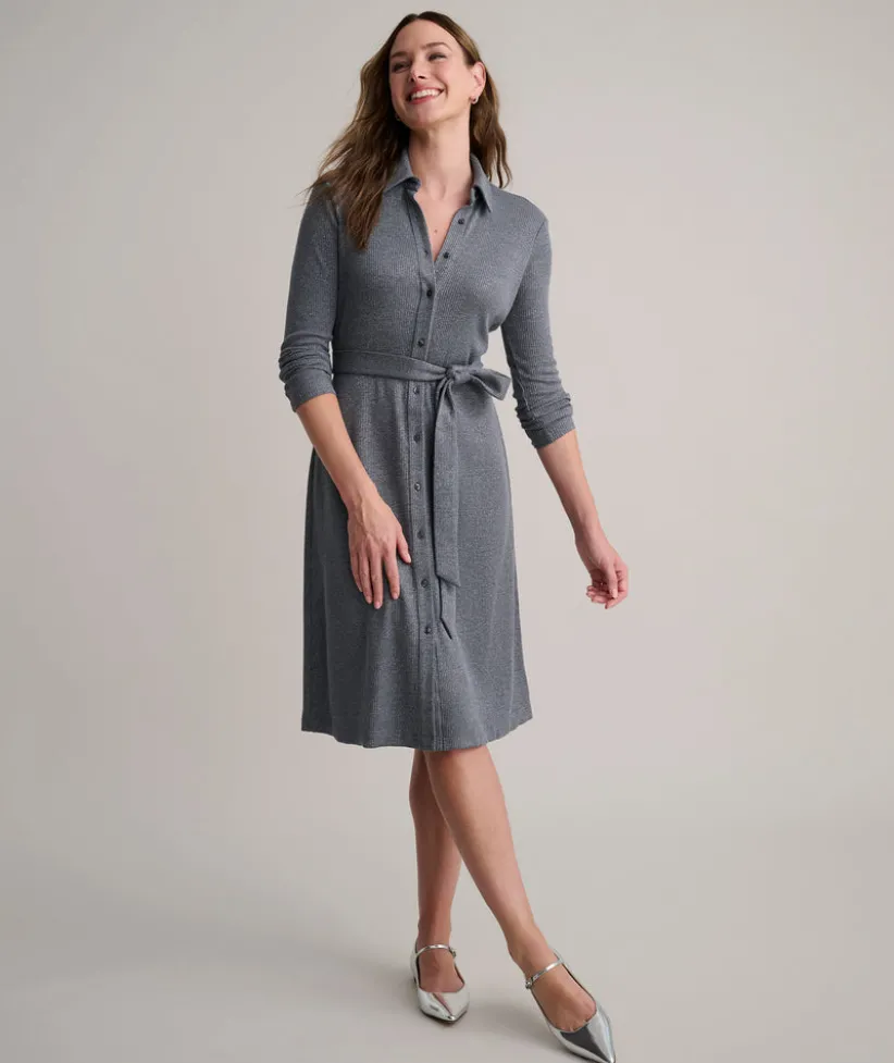 Does your closet need something glitzy and holiday-ready—but not too stuffy? You’re in luck. This ribbed dress has subtle shimmer woven in so it glows under evening lights without screaming. It’s stretchy, comfortable, and seasonally polished—perfect for low-key dinners, at-home parties, or casual holiday nights when sequins are too much.