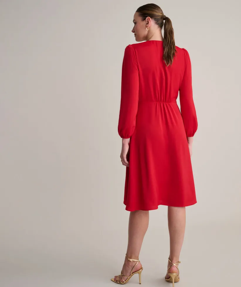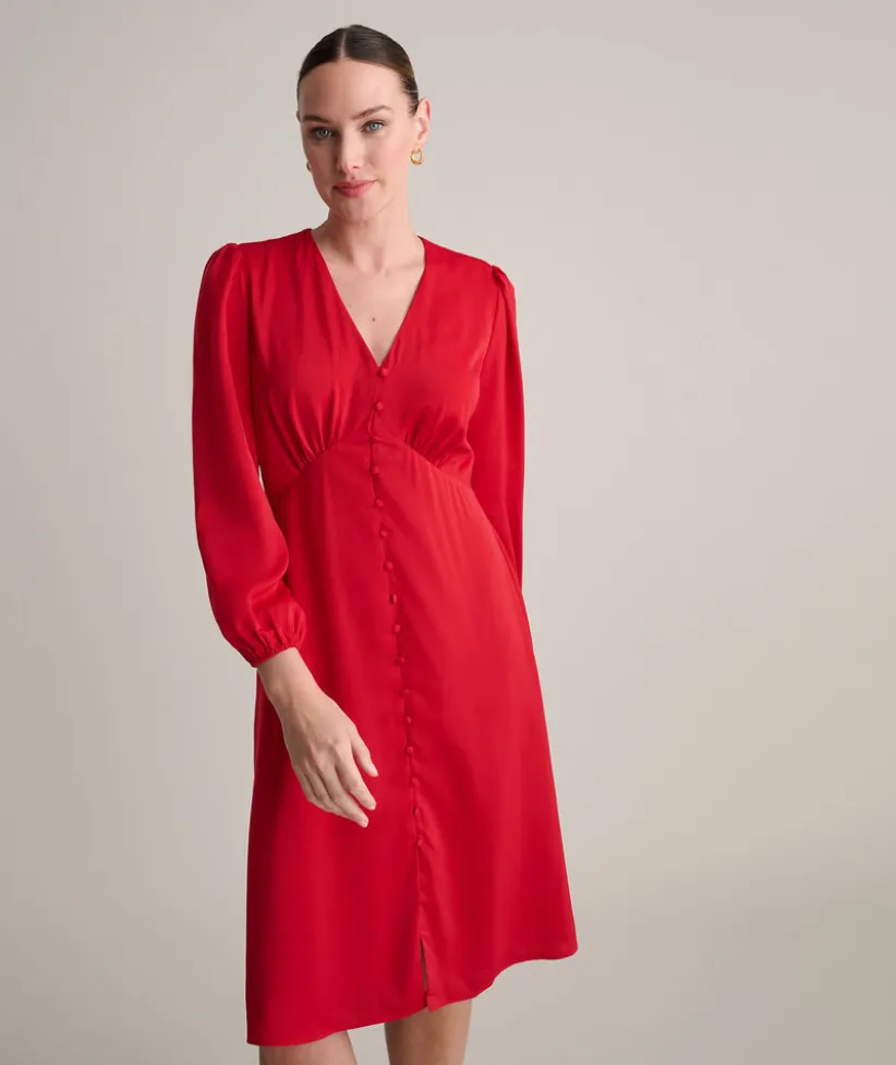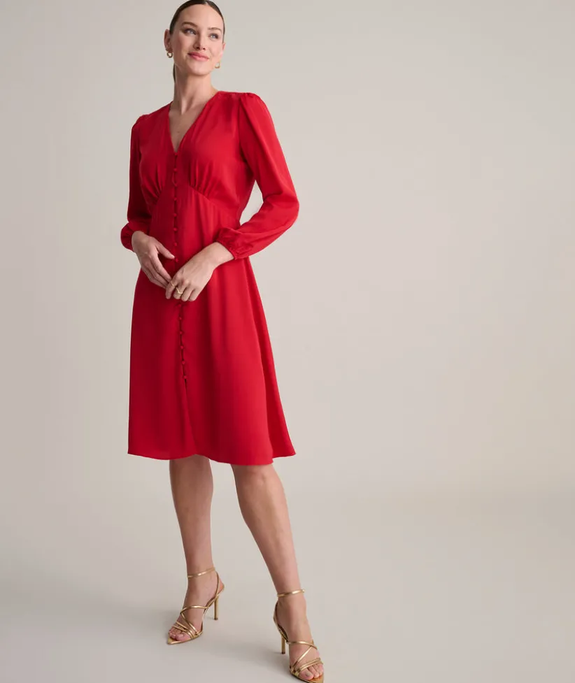 Getting dressed is a cinch with our easy-to-wear Malorie Dress. It features a bold red color, flattering silhouette, and full-button front. What’s more, it’s body lined for hours of comfort and has just enough stretch to move with you all day or night long.