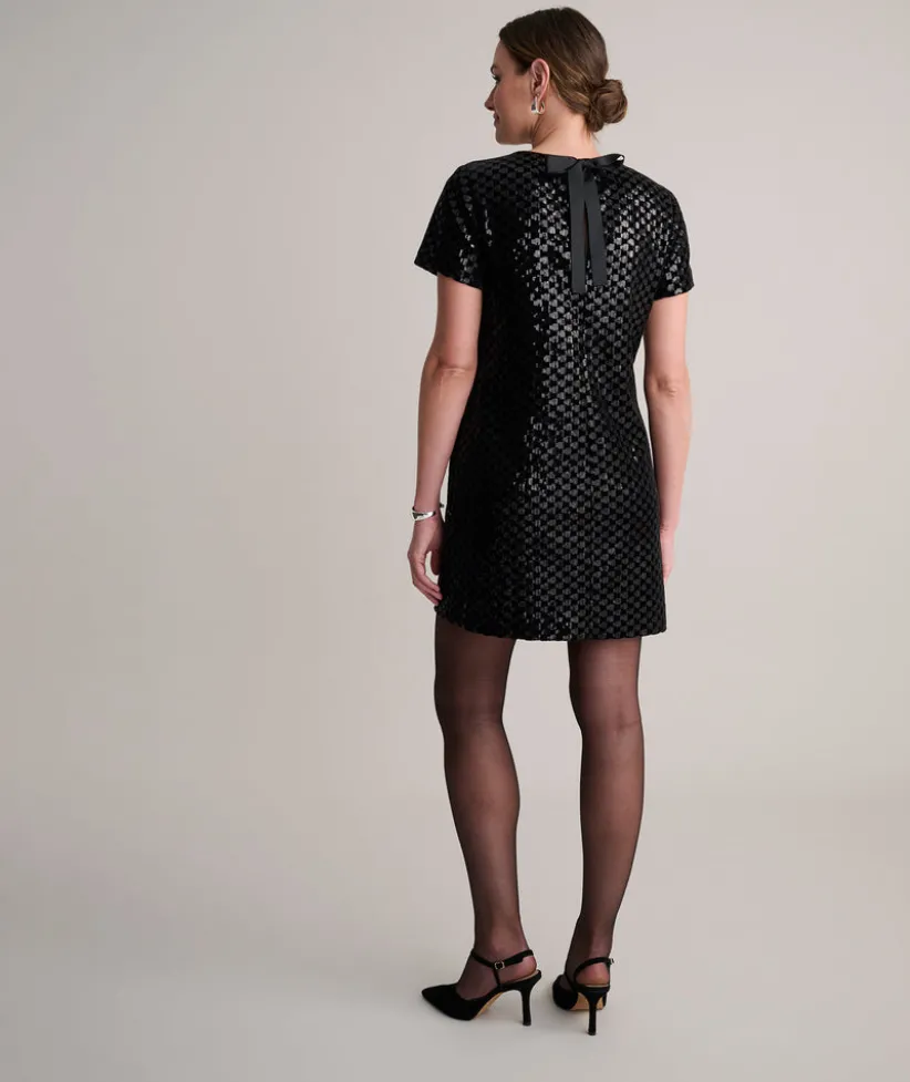 Have a holiday party on the calendar? This shift dress makes it easy. The sequinned velvet fabric delivers all the drama without feeling tight or fussy, and the grosgrain ribbon tie in back gives it a polished finish from every angle. Itās festive enough for family gatherings and classy enough for office partiesājust add heels and go.