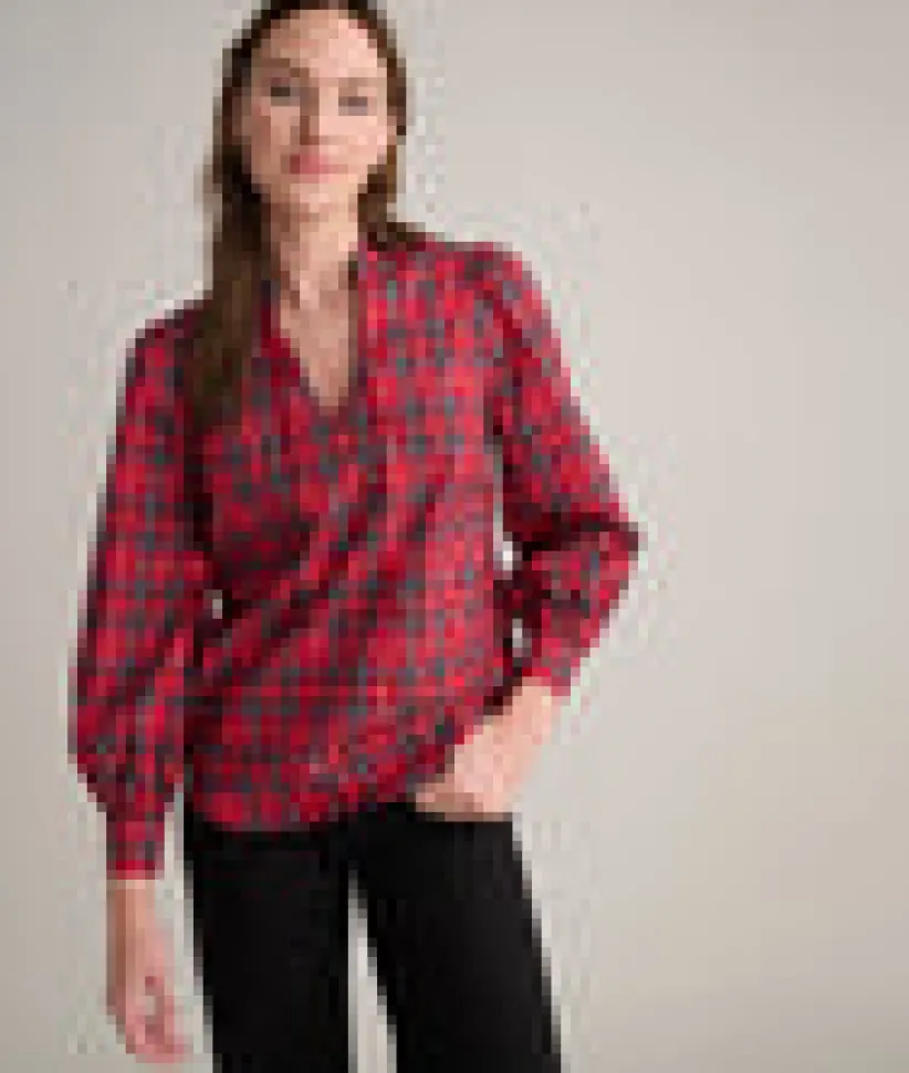 Looking to shake up your holiday look? Look no further. Our feminine Joy Shirt is the must-have style of the season. Featuring a classic tartan plaid pattern with metallic thread details for a hint of shine, this comfortable style is a great conversation starter for your next event. The popover split V-neck is timelessly chic, and the perfect-length shirttail hem can be worn untucked or tucked in.