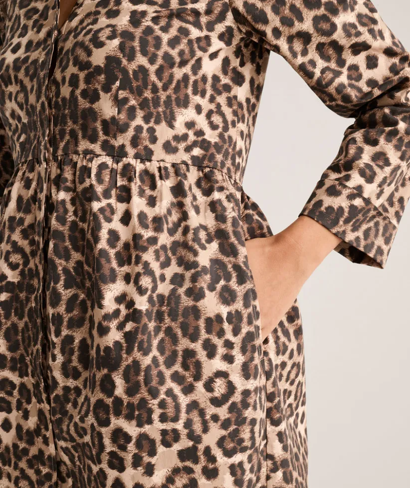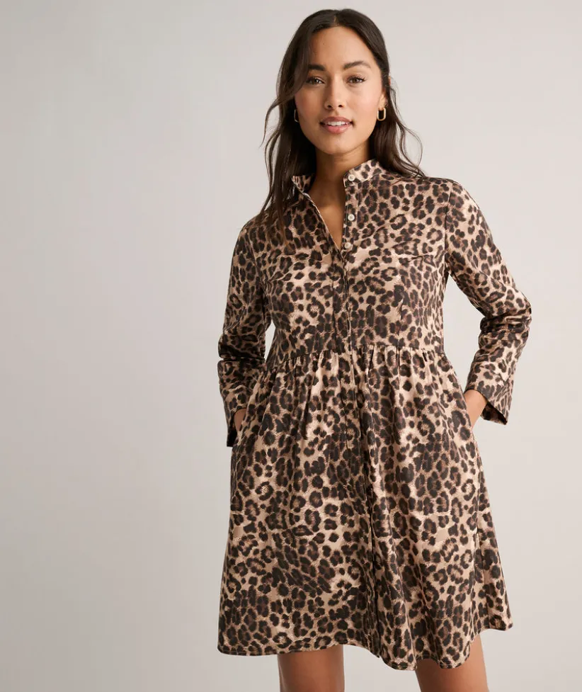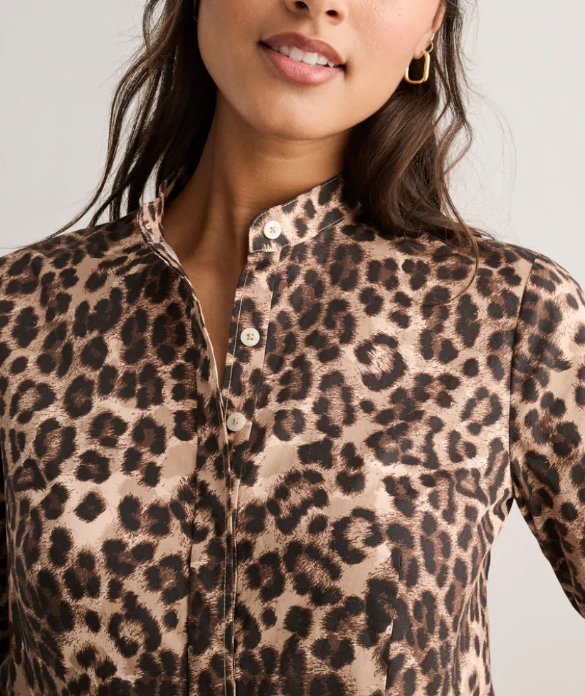 Fall doesnāt start until you slip on this fun, flattering shirt dress. The just-right length works for any event, from an office party to a weekend getaway. Plus, the cotton blend fabric has just enough stretch to keep you comfortable all day. But itās the eye-catching leopard print and classic band collar that brings the personality to whatever get-together youāre off to.