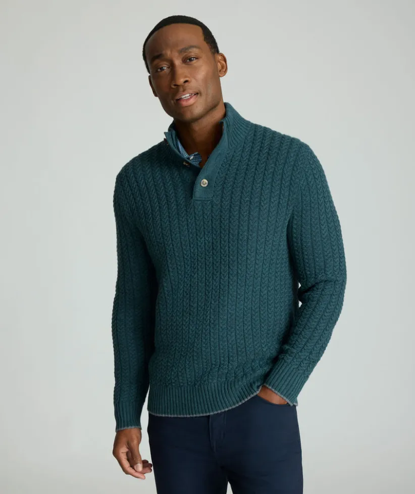 Our newest extrasoft layer is the sharpest way to dress up any UNTUCKit shirt this holiday season. It features a sophisticated cable knit design that’s perfect for special occasionsāor just looking great every day. It features a sharp button neck so you can adjust your temperature. Wear it with our Classic Chino Pants with stretch for that big holiday event you have coming up.