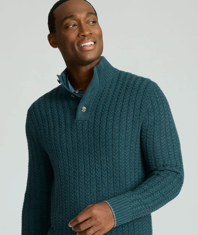 Our newest extrasoft layer is the sharpest way to dress up any UNTUCKit shirt this holiday season. It features a sophisticated cable knit design that’s perfect for special occasions—or just looking great every day. It features a sharp button neck so you can adjust your temperature. Wear it with our Classic Chino Pants with stretch for that big holiday event you have coming up.