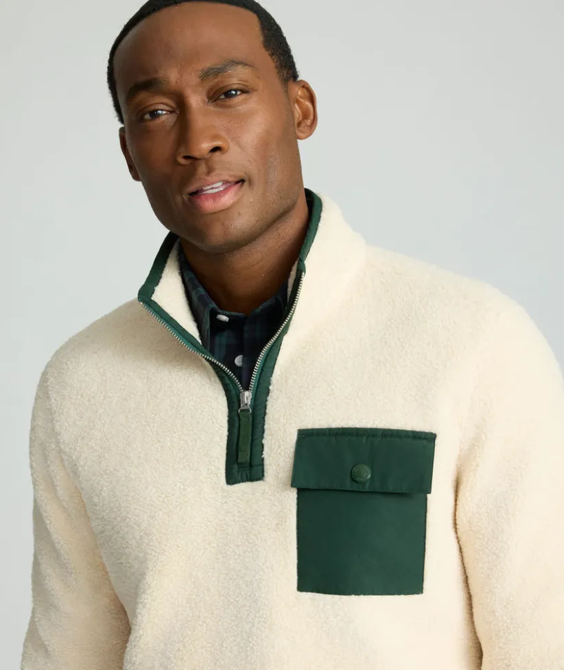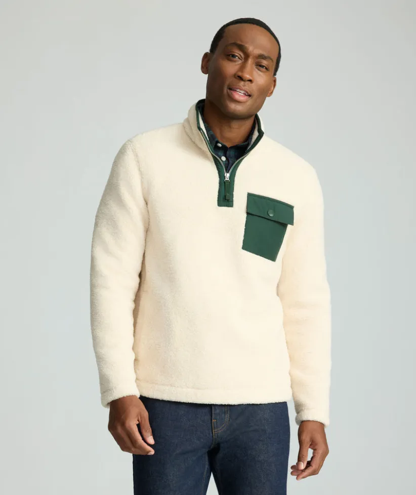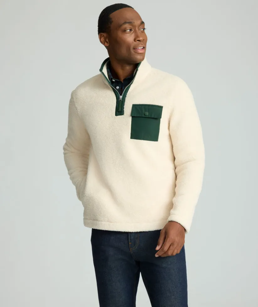 This easy faux sherpa pullover is an essential style this season. Its wintery color is sharp and festive, while also understated. It’s also a smart way to dress up any shirt this holiday season. It features a rich texture that’s perfect for keeping you warm every day. It features an easy zipper neck so you can adjust your temperature easily. Wear it with our Classic Chino Pants with stretch for that big holiday event you have coming up.