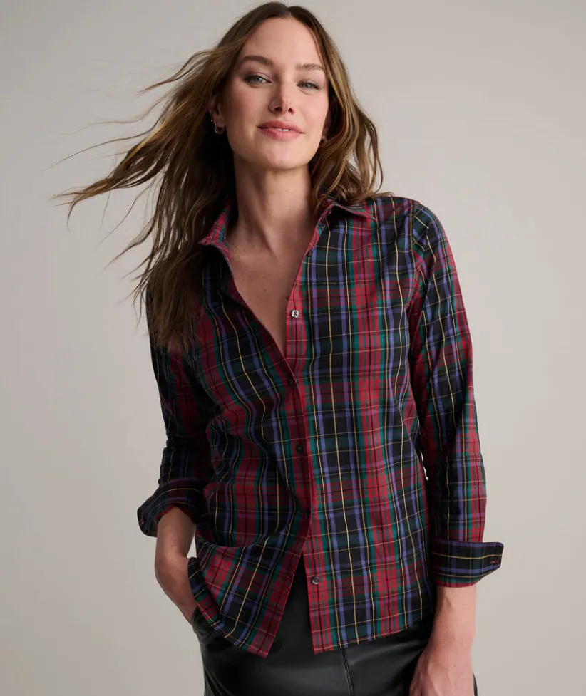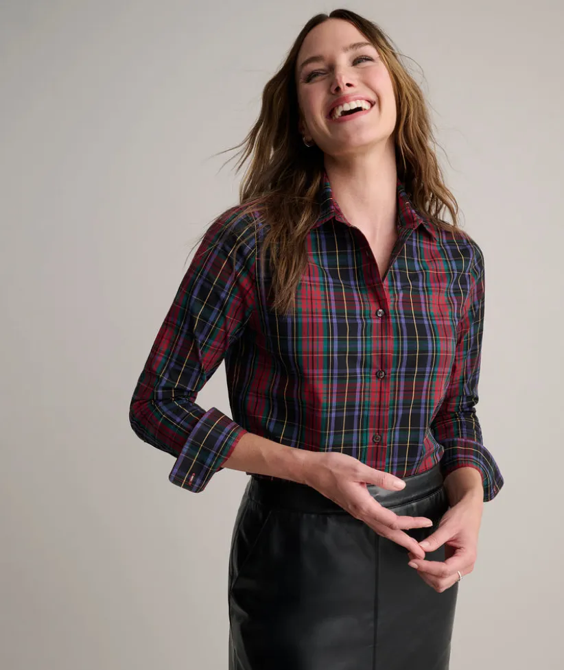 Need to refresh your holiday wardrobe? This polished plaid shirt is festively fun and made with a hint of stretch for everyday ease. It drapes nicely untucked and pairs with everything from denim to a skirtāmaking it one of the most versatile tops in your winter rotation. Wear it with a blazer or our Faux Leather Aubrey Skirt for the holiday event you have coming up.