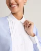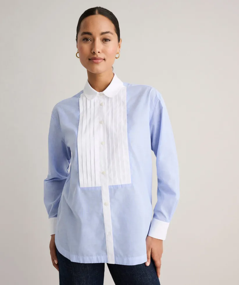 Getting dressed up is a cinch with our easy-to-wear Danielle Shirt. It features a subtle blue-and-white palette in a fine end-on-end weave, flattering silhouette, and button-up front. Even better, we added a polished rounded collar, chic contrast accents at the placket, cuffs, and sleeves, and a tuxedo bib so you can look great from work to the weekend and everywhere in between.