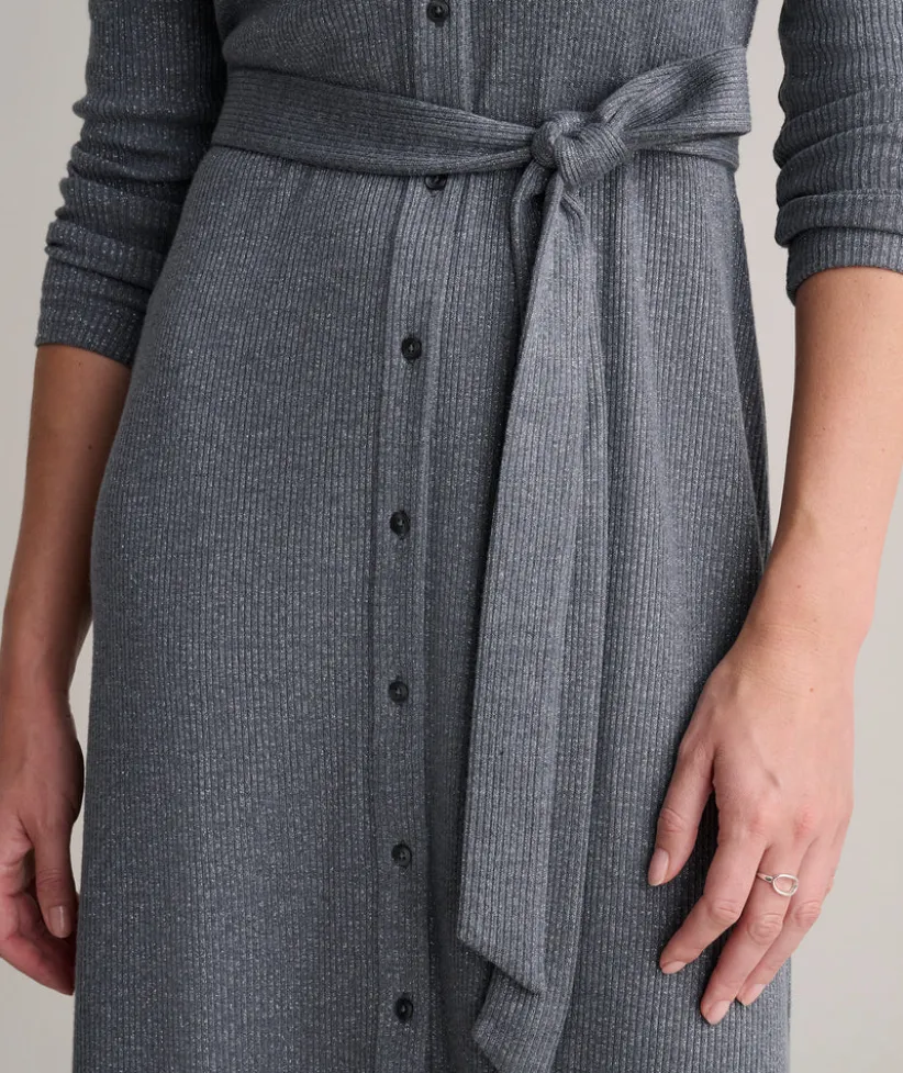 Does your closet need something glitzy and holiday-ready—but not too stuffy? You’re in luck. This ribbed dress has subtle shimmer woven in so it glows under evening lights without screaming. It’s stretchy, comfortable, and seasonally polished—perfect for low-key dinners, at-home parties, or casual holiday nights when sequins are too much.