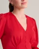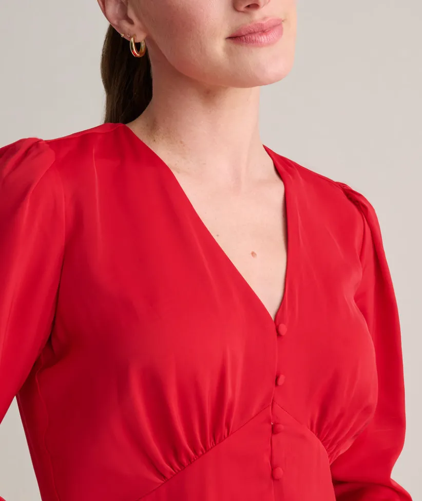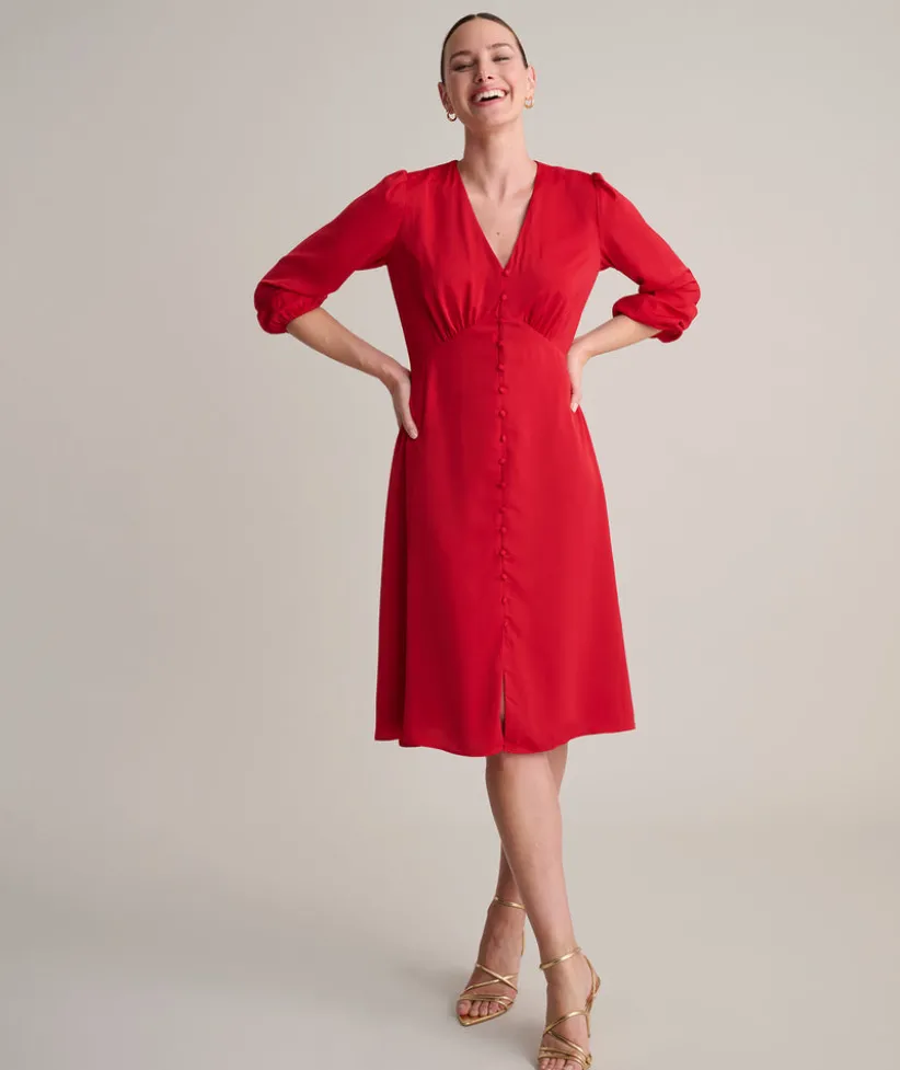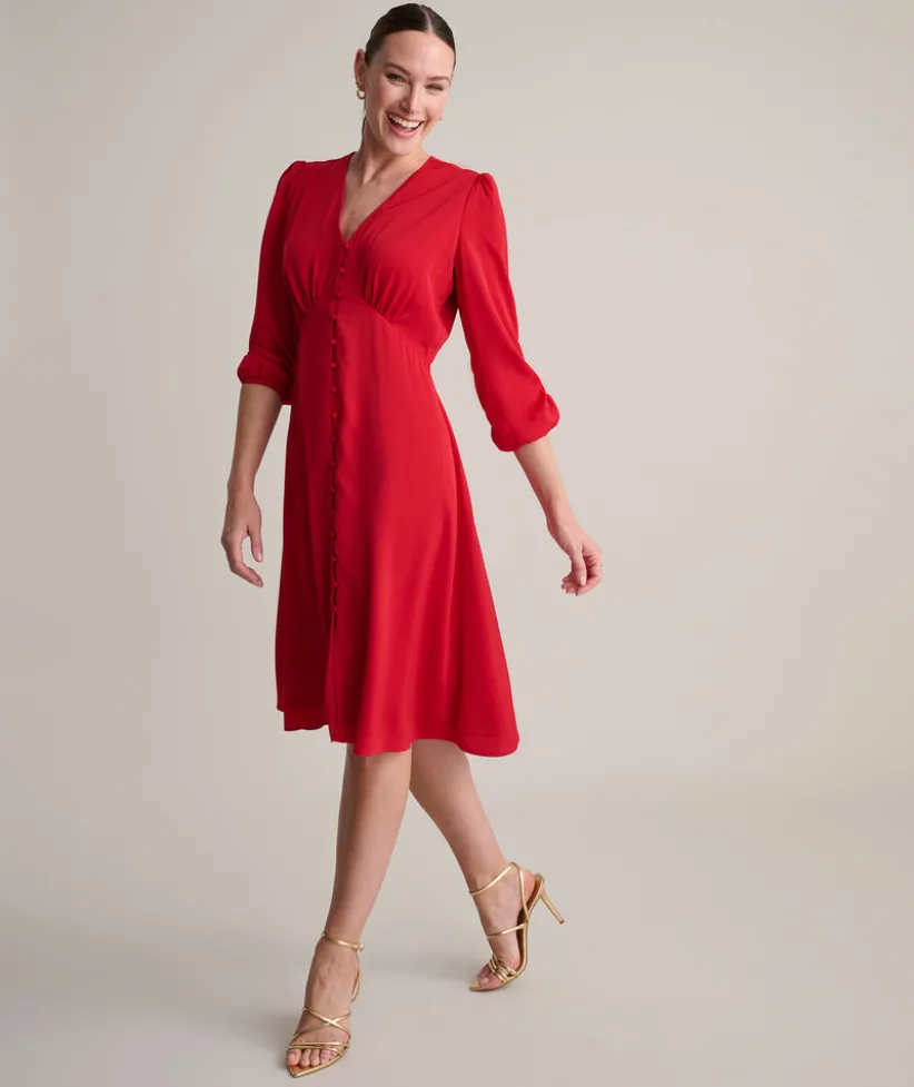 Getting dressed is a cinch with our easy-to-wear Malorie Dress. It features a bold red color, flattering silhouette, and full-button front. What’s more, it’s body lined for hours of comfort and has just enough stretch to move with you all day or night long.