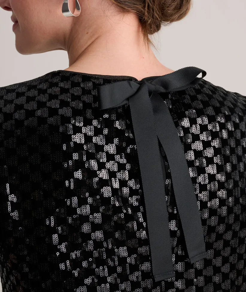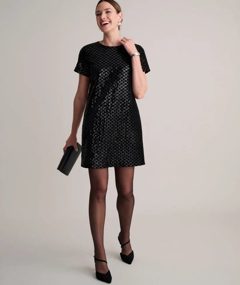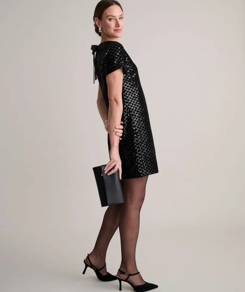Have a holiday party on the calendar? This shift dress makes it easy. The sequinned velvet fabric delivers all the drama without feeling tight or fussy, and the grosgrain ribbon tie in back gives it a polished finish from every angle. Itās festive enough for family gatherings and classy enough for office partiesājust add heels and go.