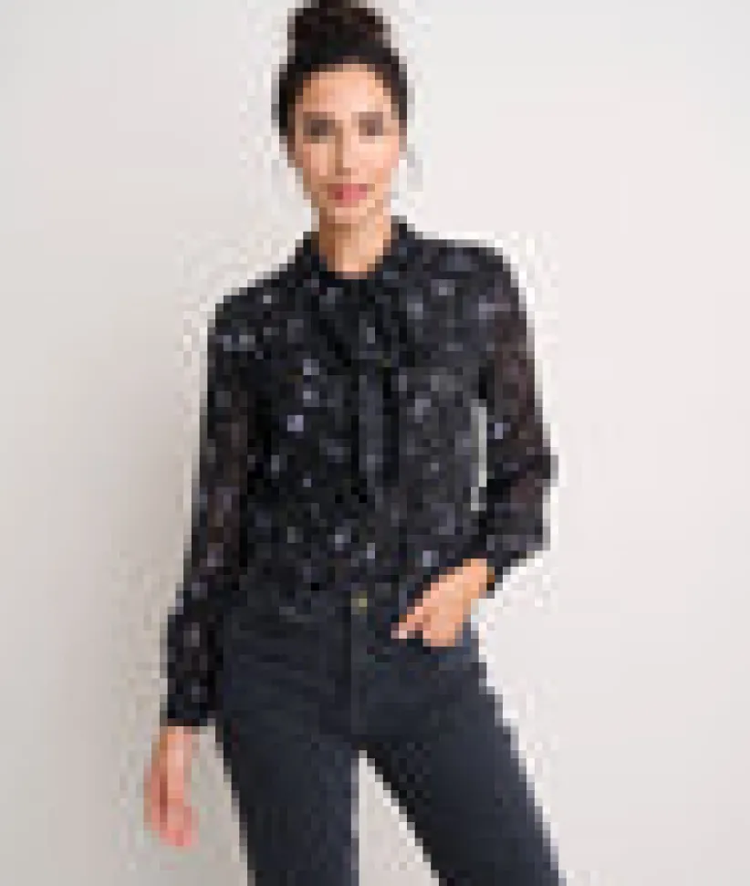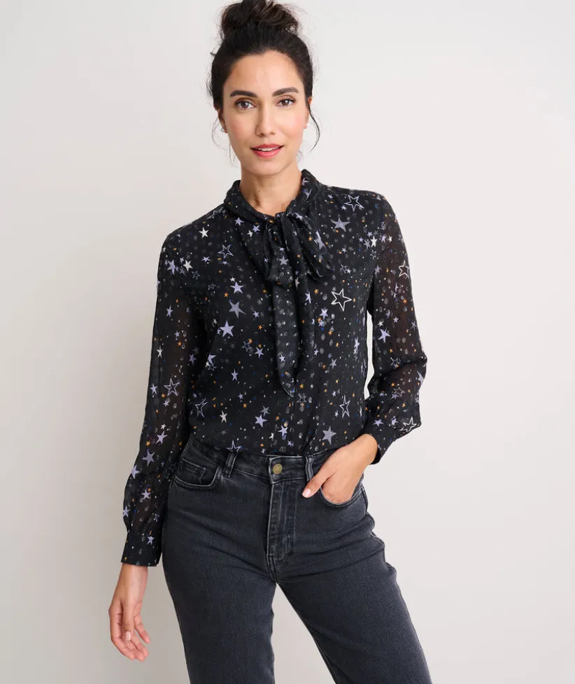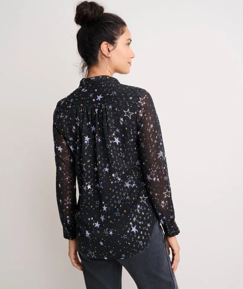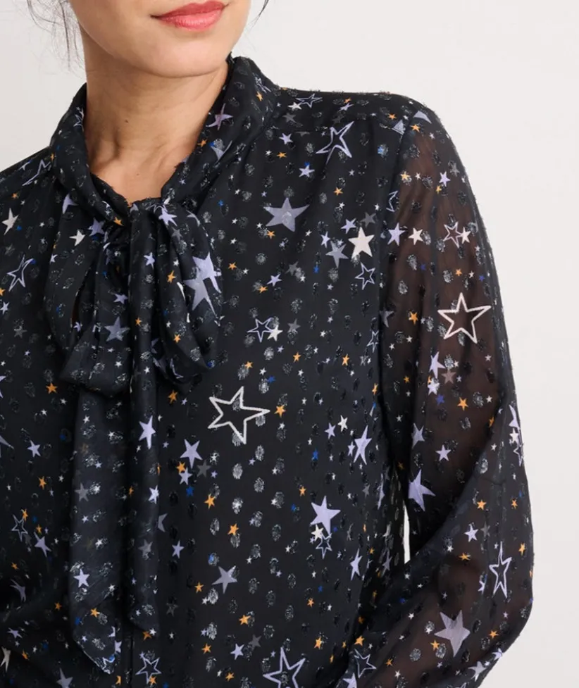 Shoot for the stars with this bold printed style. The Colette Shirt brings feminine flair with comfortable sheer sleeves, a fully lined body, and an elegant neck tie. The striking star printāa standout for the seasonāis sure to make an impression at your next holiday party.