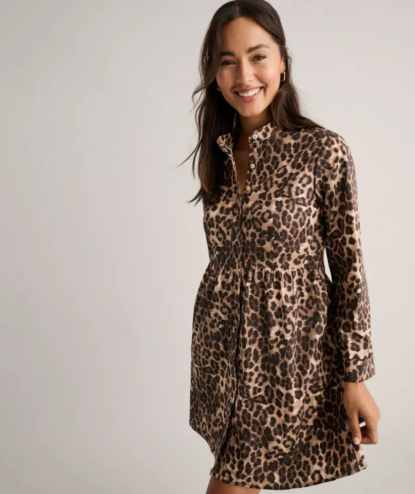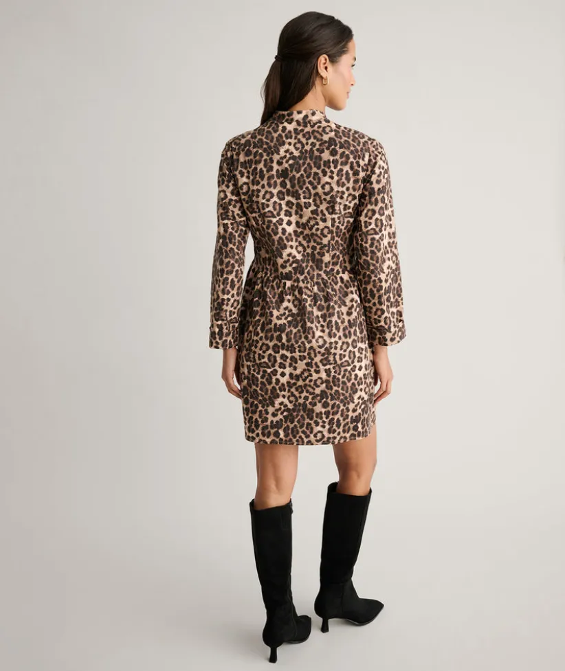 Fall doesnāt start until you slip on this fun, flattering shirt dress. The just-right length works for any event, from an office party to a weekend getaway. Plus, the cotton blend fabric has just enough stretch to keep you comfortable all day. But itās the eye-catching leopard print and classic band collar that brings the personality to whatever get-together youāre off to.