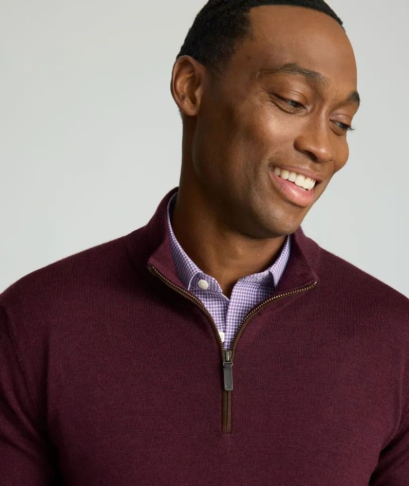 “When it’s chilly out, grab this easy pullover for added style and warmth. Made from 100% breathable wool, this quarter-zip sweater naturally regulates your body temperature so you won’t overheat. The mock collar, faux suede placket, easy zipper, and solid color give it an elevated style that still feels laid-back. Layer it over one of our perfect-fitting untucked button-downs with a pair of Classic Chino Pants for an effortless look this season.